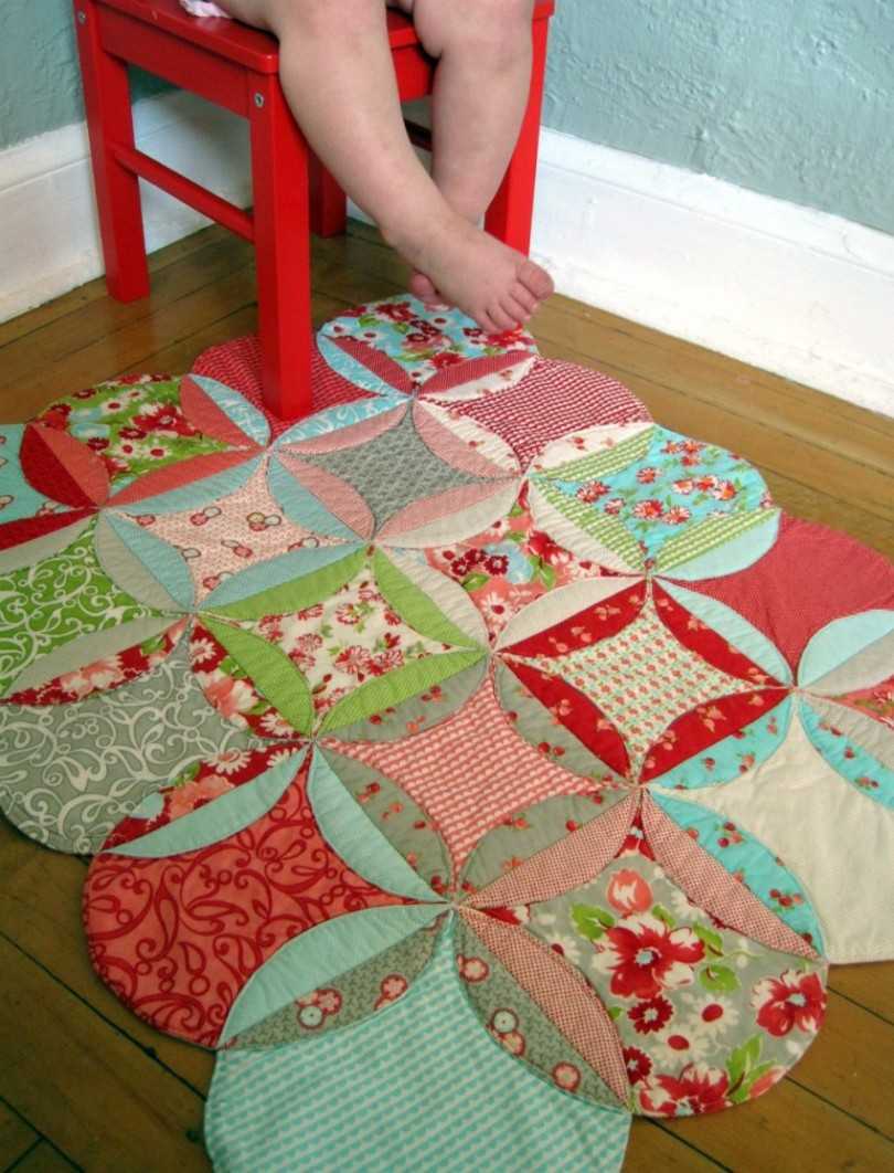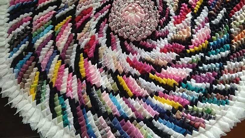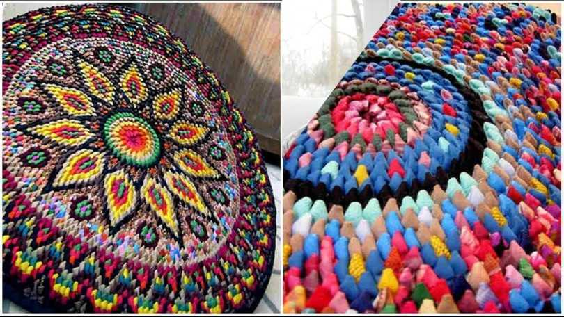 Есть варианты изготовления подобных половиков и без специальных инструментов. Техник предлагается немало: плетение кос и соединение их между собой, использование совсем мелких кусочков и создание эффекта пушистости, ткачество. Такие изделия из ткани украсит не только городскую квартиру, но будут уместными в дачном домике или предбаннике.