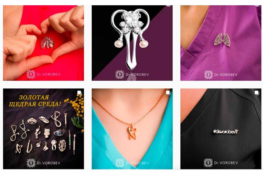 А вот другой пример уникальной ЦА. Ювелирные украшения, которые покупают в подарок врачам. И сммщики очень чётко обыгрывают это в контенте: например, на фотографиях украшения приколоты к медицинскому халату или хирургическому костюму, а в описании всегда указана профессия. Сразу понятно, кому именно подойдёт то или иное украшение.