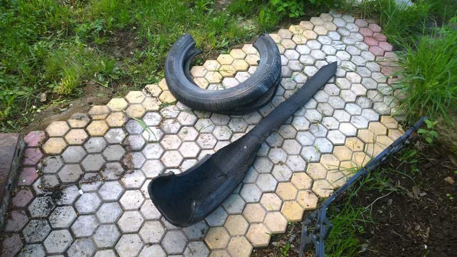 - Подготовка резины. При помощи ножа у шин нужно удалить боковины. Оставшаяся часть разрезается поперек протектора. В итоге должна получиться резиновая полоса. Таким способом нужно заготовить необходимое количество материала;