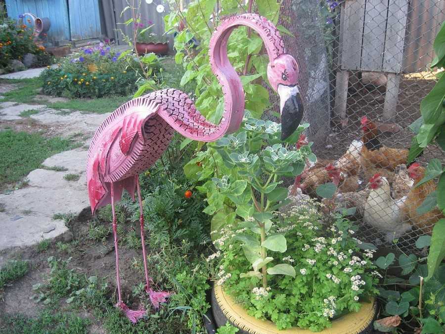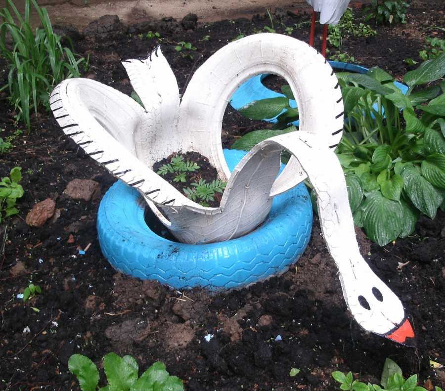 Такие поделки непременно оживят ваш дачный участок и принесут много положительных эмоций, особенно вашим детям. Одной из самых популярных поделок из покрышек для дачи является лебедь. Для этого понадобится шина без металлокорда- ее легче будет разрезать. Разрезы делать необходимо согласно заранее подготовленной разметке на шине острым ножом. Шею готовому лебедю можно укрепить железным прутиком. На заключительном этапе покрасить готовый каркас соответствующими цветами краски.