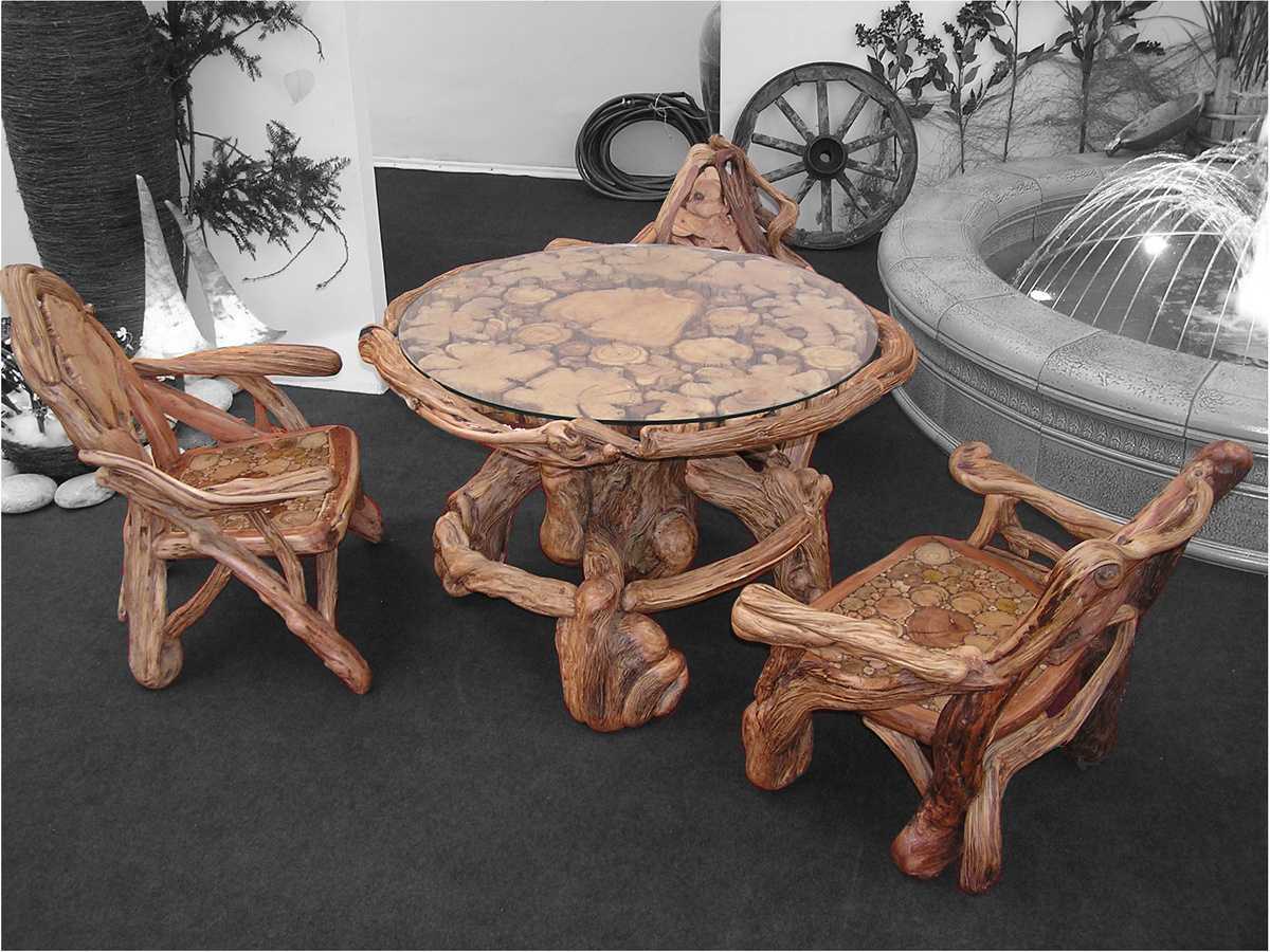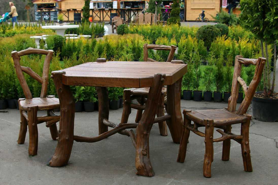 Самый простой вариант такой фурнитуры – пни и разные по размеру колоды. Спилите ровным срезом пень – и стол со стульями полностью готовы выполнять свои прямые функции!