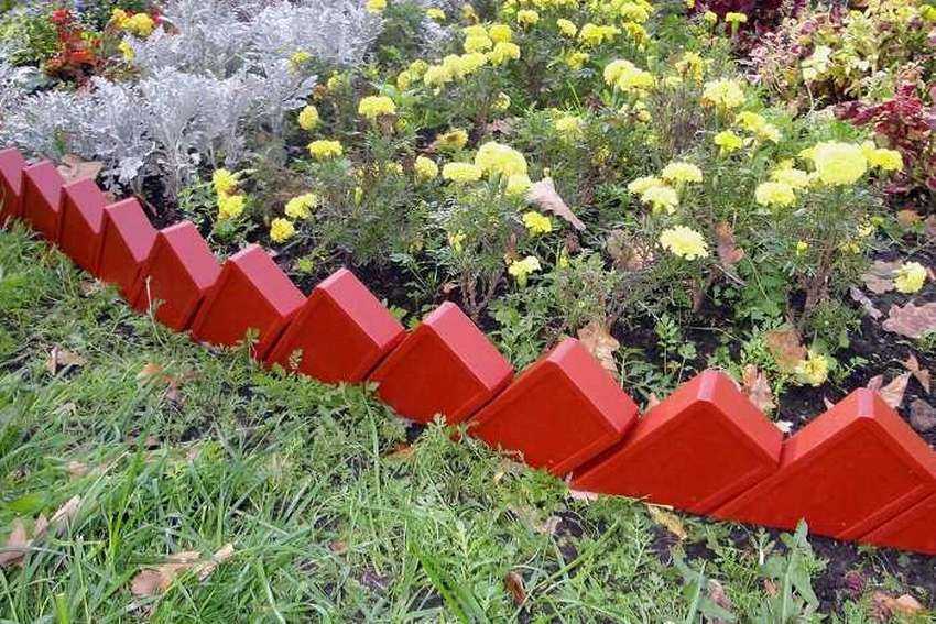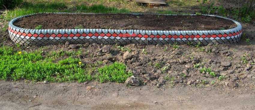 Если в вашем распоряжении имеются ненужные бутыли, керамическая плитка, трубы, резиновые покрышки или тарелки, вы можете соорудить загородку из них. Шины могут послужить ёмкостью для грядки, а из пустых бутылок можно выложить красивый заборчик. Дополнить вышеперечисленные заграждения можно насыпным бордюром из мелкого камня. Интересно, что в последнее время бетон для создания бортиков применяется крайне редко.