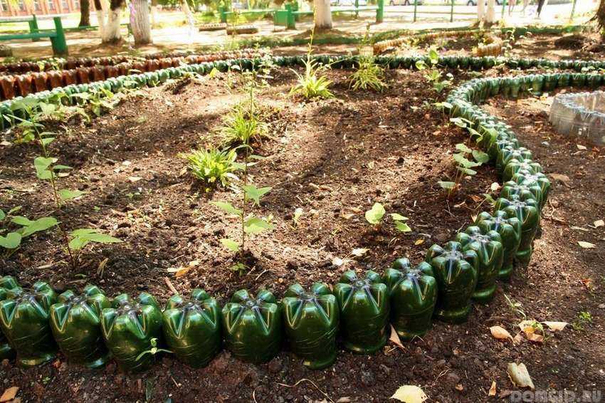 Очень просто сделать ограждение для грядки из ненужных материалов, например пластиковых бутылок