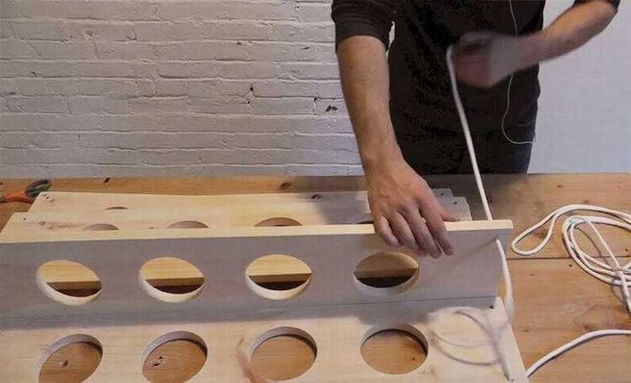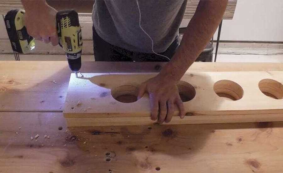 В досках для полок сверлятся отверстия под размер горшков и для крепления веревки: