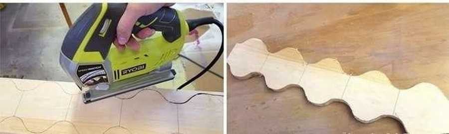 Далее следует процесс выпиливания деревянных деталей длиной в 60 см. Далее планки укладываются вместе и фиксируются с помощью бруска, длина которого составляет 20 см.
