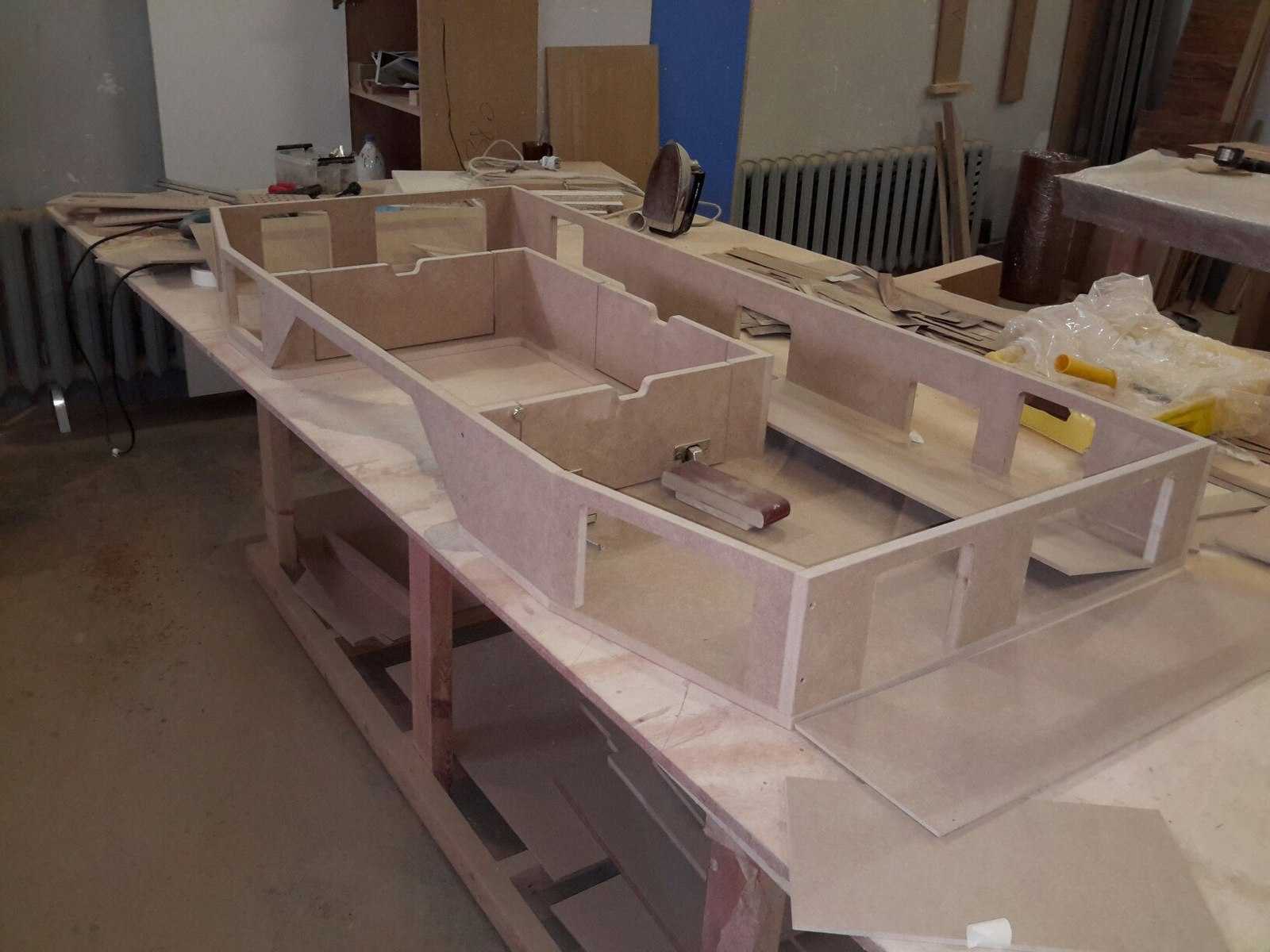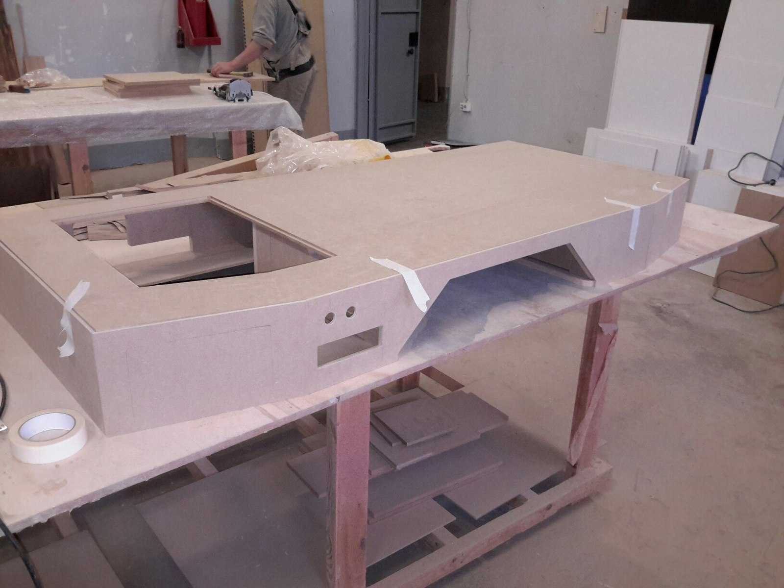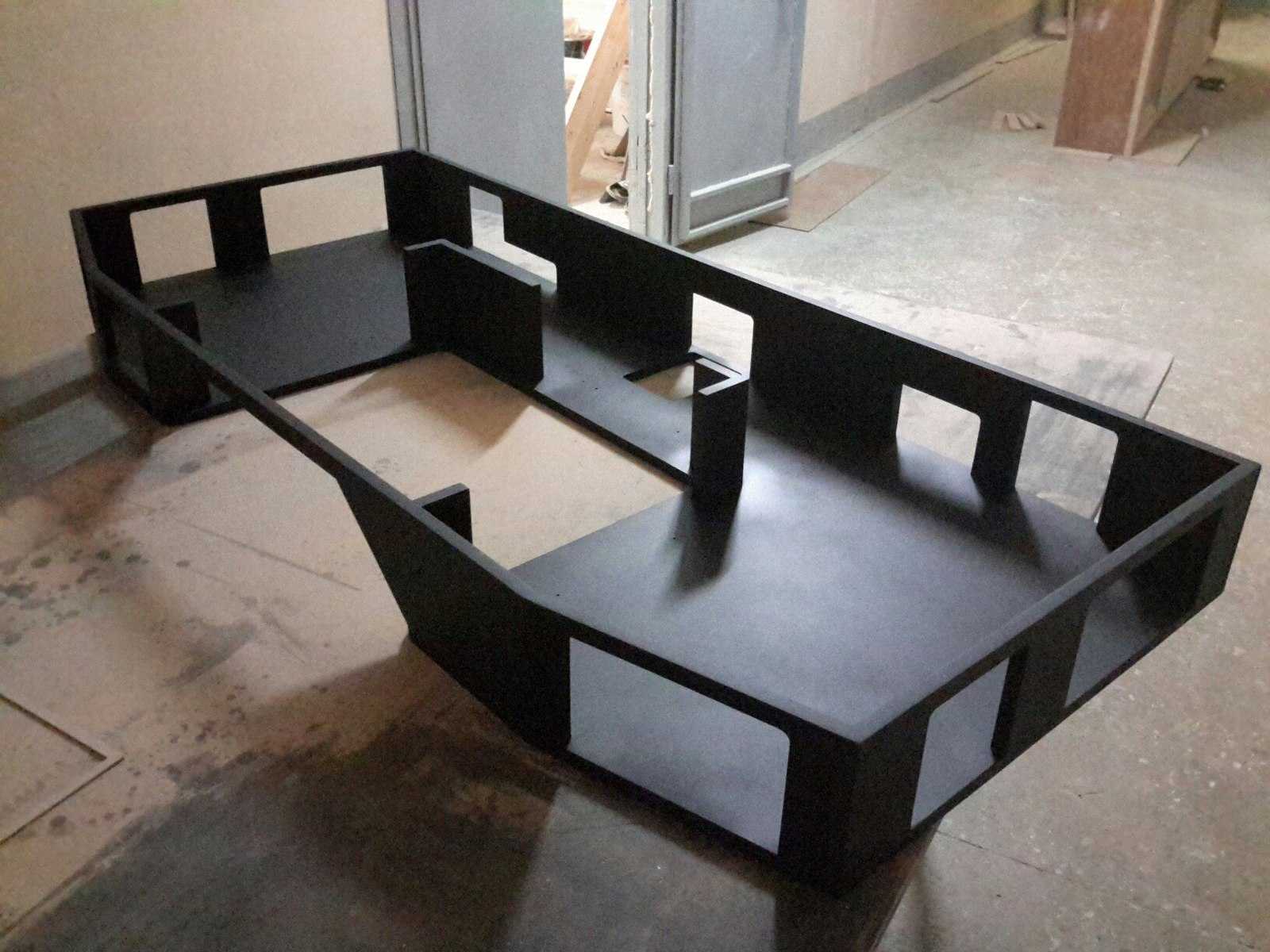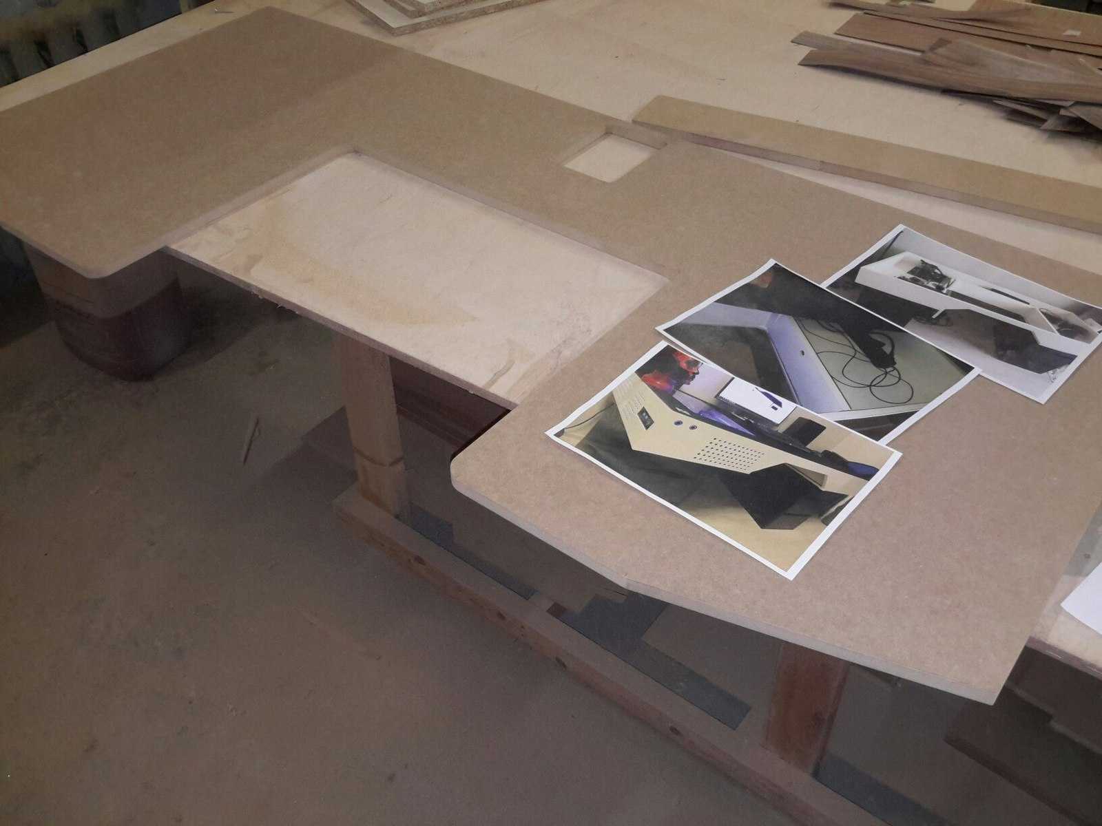 - Подготавливаем столешницу. Вырезаем, шлифуем и фрезеруем. Вырезаем отверстие для проводов.