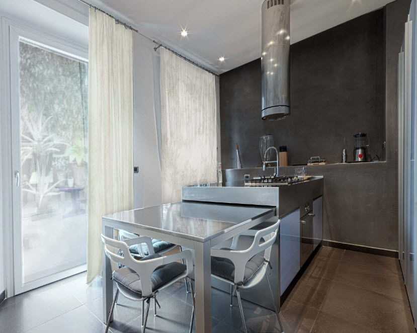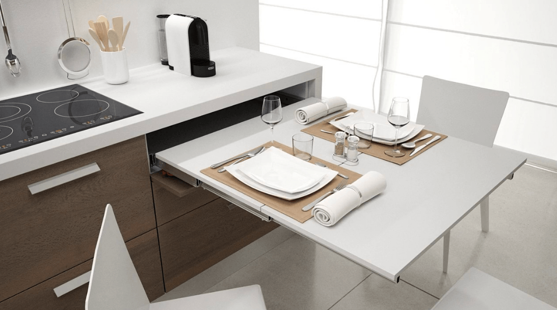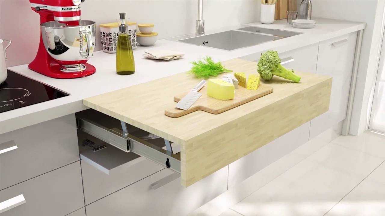 Выдвижные столики изготавливаются из дерева, ЛДСП, МДФ, пластика, стекла, искусственного камня. Выбор подходящего варианта зависит от дизайна кухни: