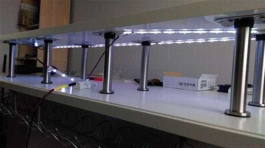 Устанавливаем на столешницу дополнительную полку с помощью мебельных ножек из нержавейки и клеим светодиодную подсветку