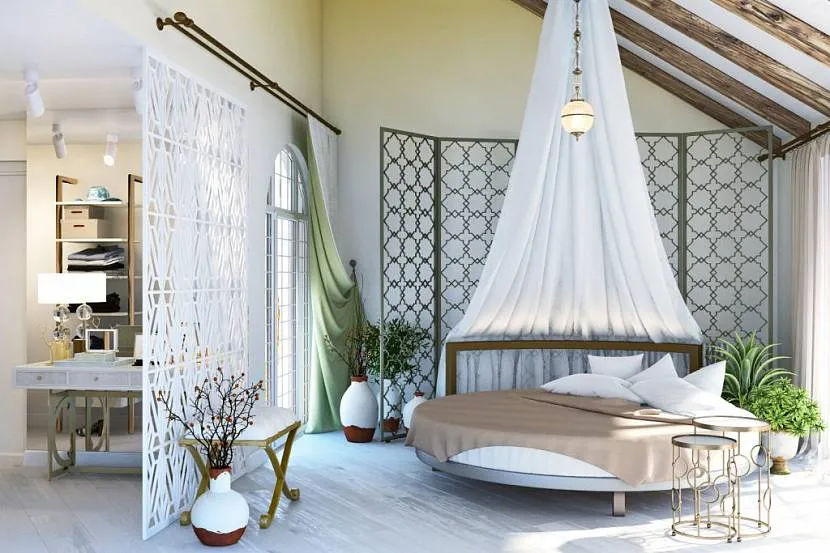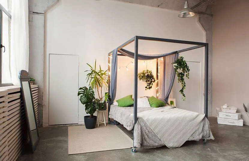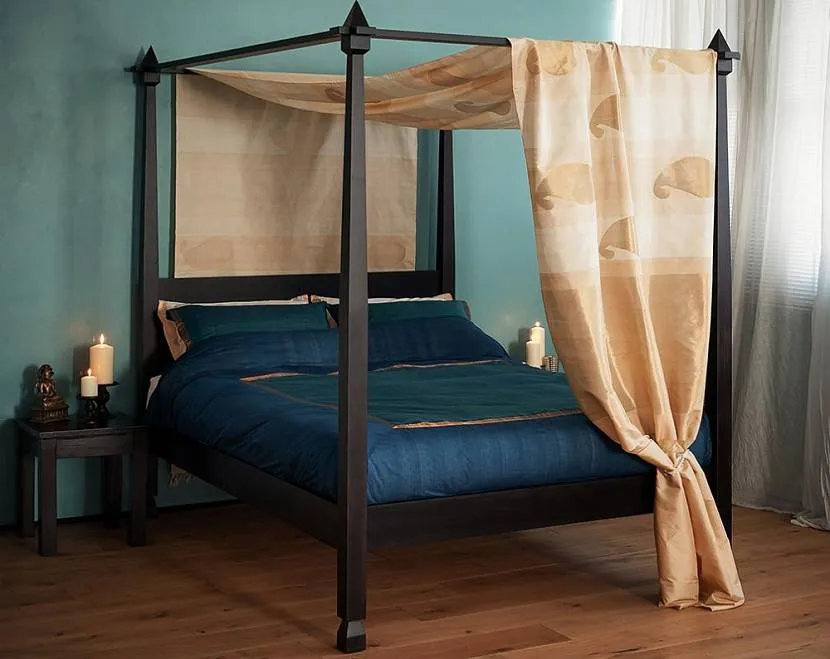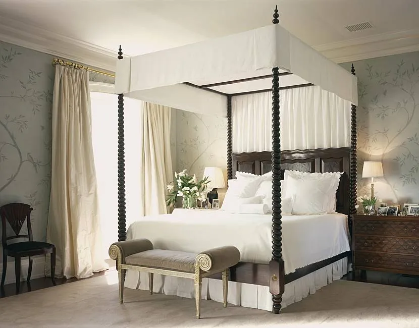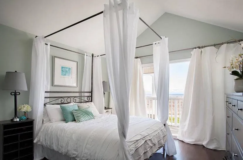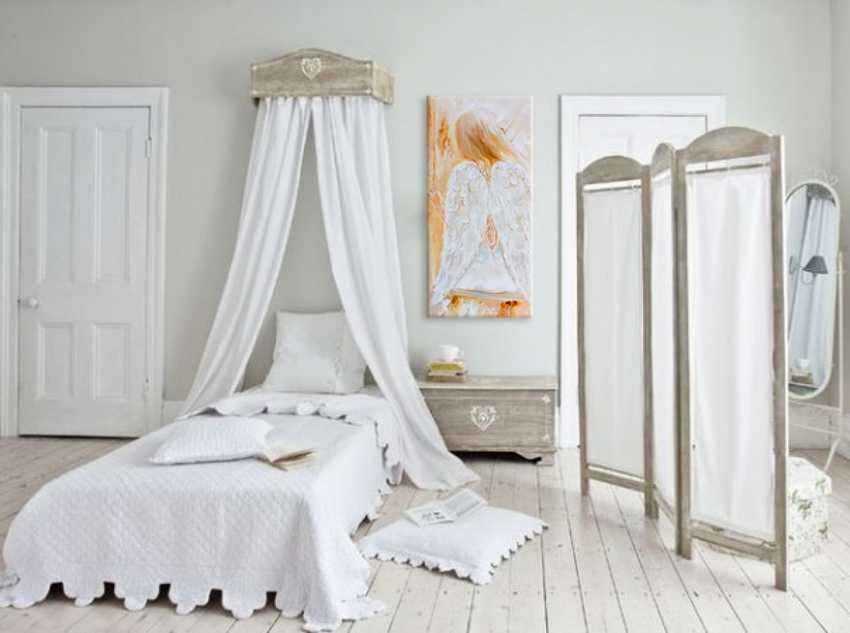Настенный навес может быть выполнен в цвет стен — это красиво и оригинально. Также цвет балдахина можно подбирать под цвет аксессуаров, мебели, декора.