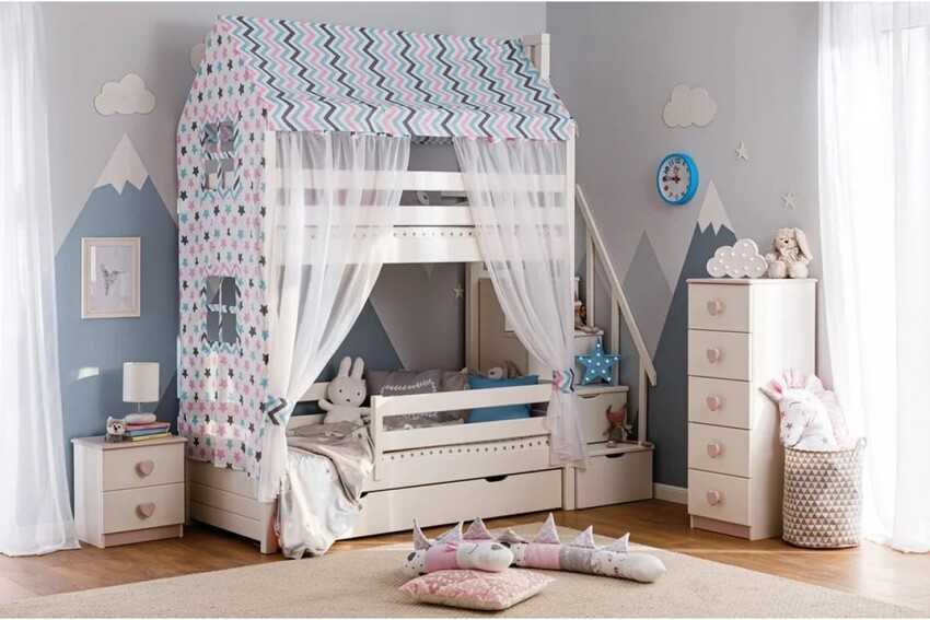 Кровать-домик оформляют самым различным декором, например это может балдахин или полог, которые предоставят возможность менять их, создавая каждый раз новое настроение в интерьере и будут являться не только украшением, но и позволят регулировать уровень освещенности во время дневного сна и защитят от сквозняка.