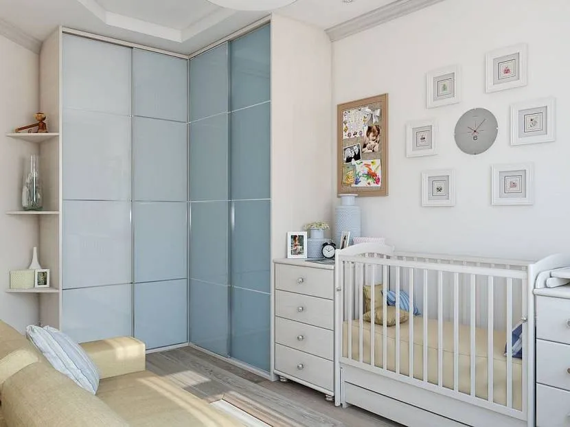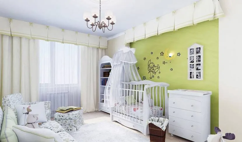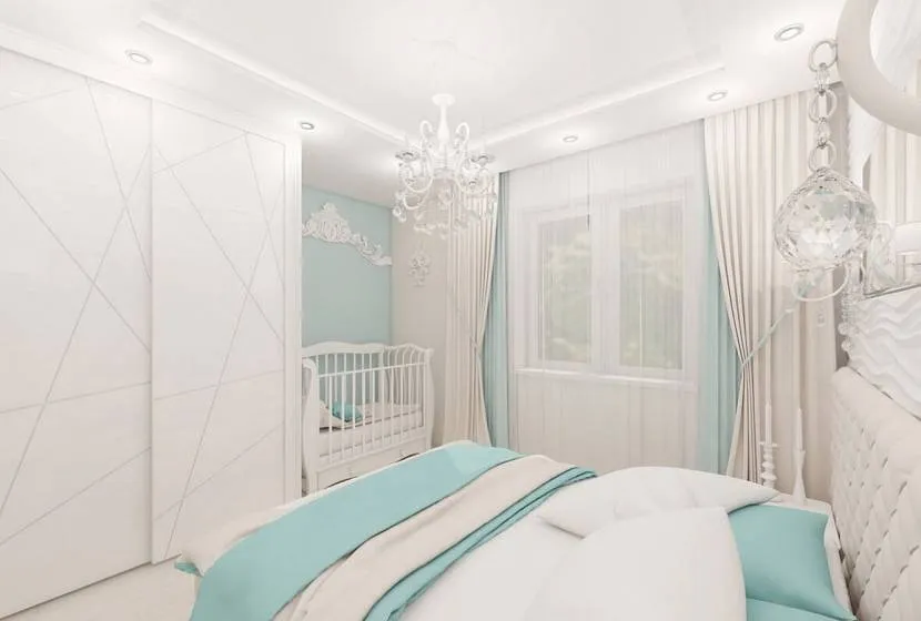 В дизайне спальни с кроваткой часто используют свежую палитру. Нежный салатовый делает комнату комфортной и живой. Небесно-голубой привнесет в помещение южной ориентации легкую прохладу. Светло-бирюзовое оформление позволяет применять синий и зеленый в зонах ребенка и взрослых.