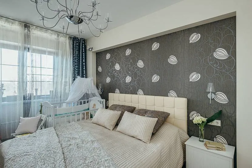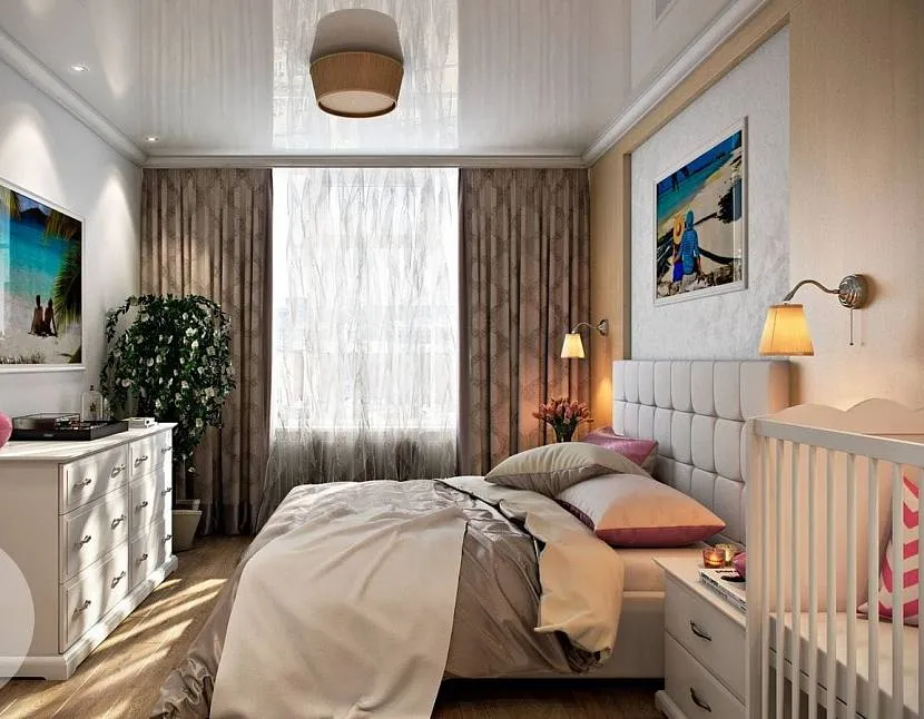 Дизайн спальни с детской кроваткой должен нравиться всем обитателям комнаты. Стены лучше выполнить в нейтральных или светлых оттенках, которые психологически не раздражают. Гармонично впишется палитра белого – от солнечного снежного до молочного и слоновой кости.