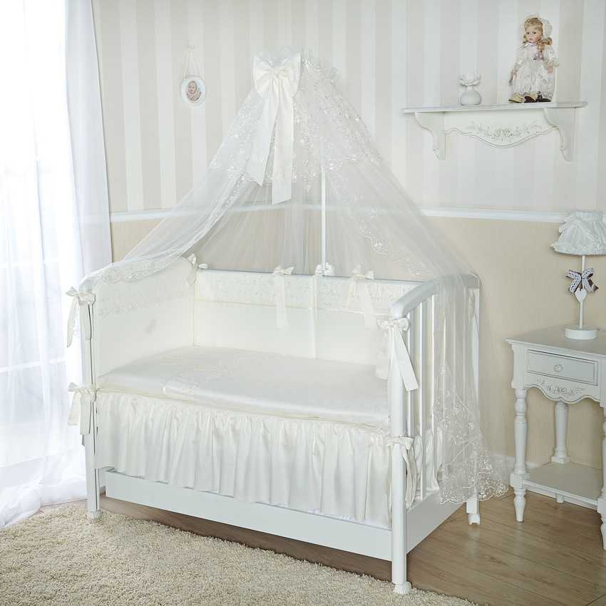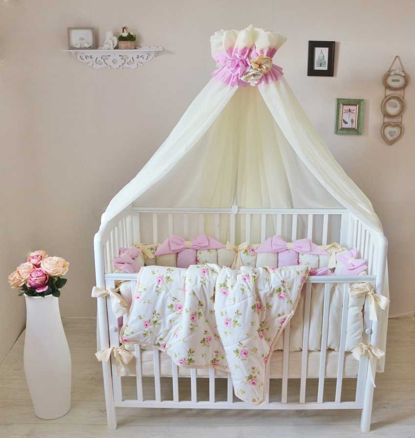 Самый красивый балдахин над кроватью из фатина с кружевом. В качестве украшений можно использовать маленькие погремушки, мягкие игрушки Мишки, амигуруми, бубенцы, фетровые сердечки, звездочки из ткани. Словом, все, что будет развлекать младенца во время бодрствования.