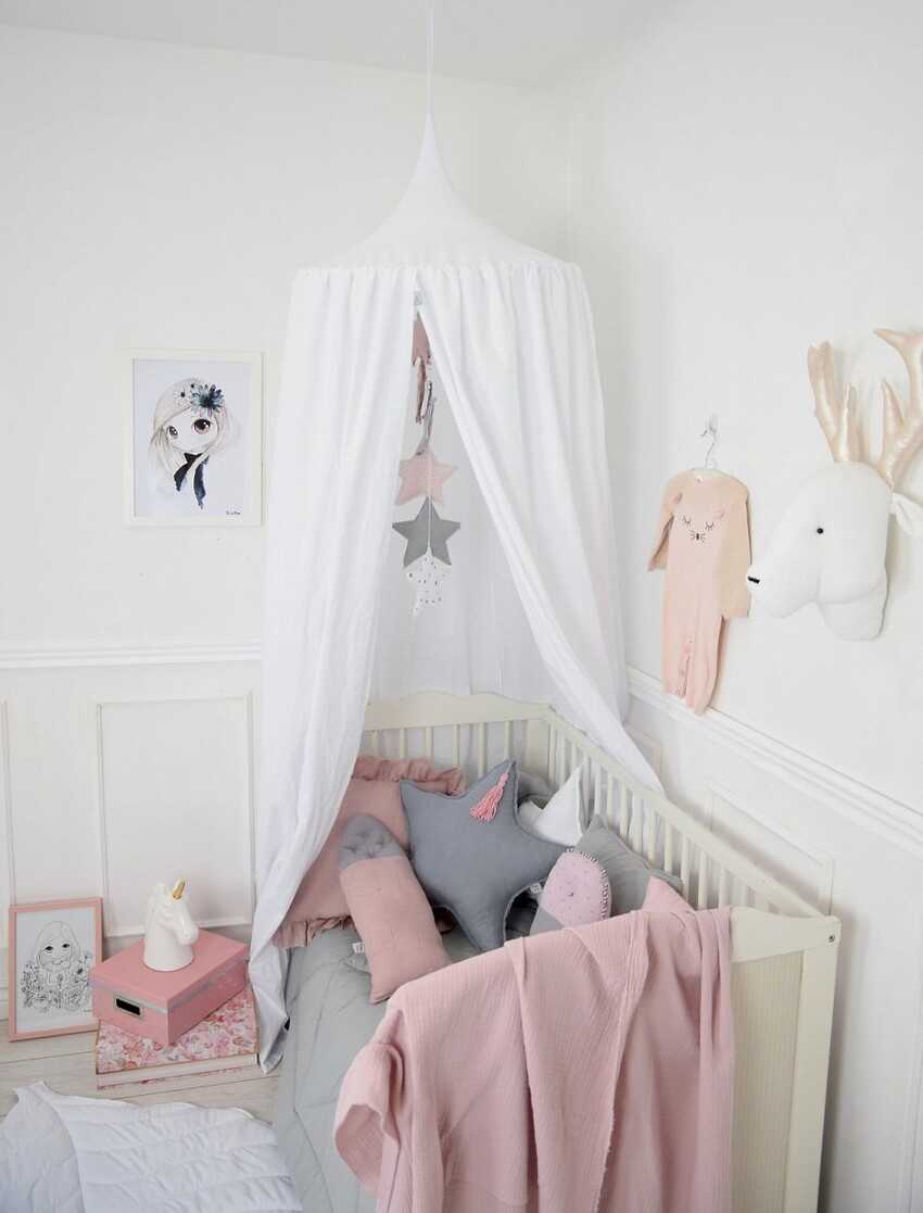 Комната, где подвешен балдахин в детскую кроватку, всегда выигрывает в дизайне. Испортить ее таким атмосферным предметом очень сложно.