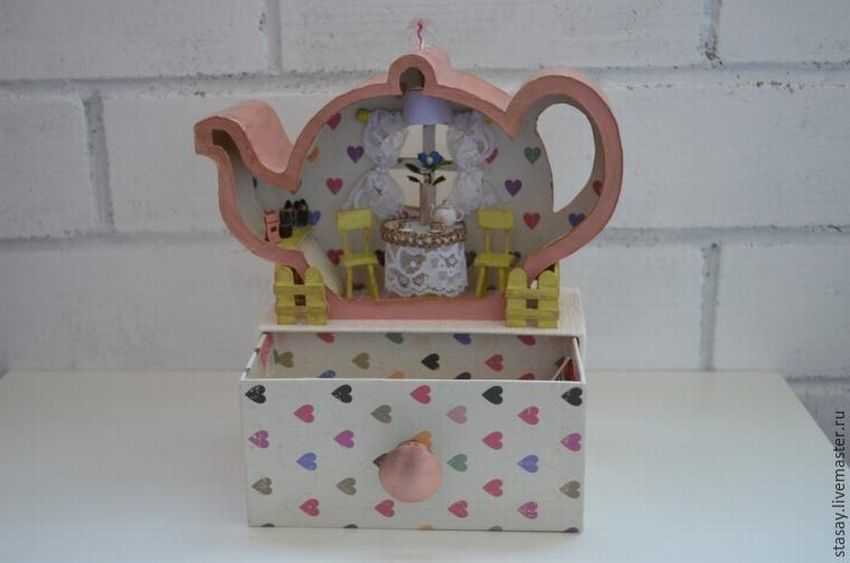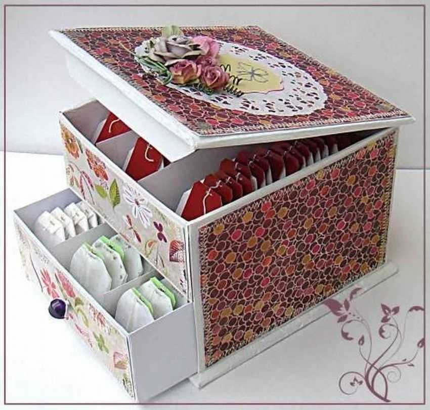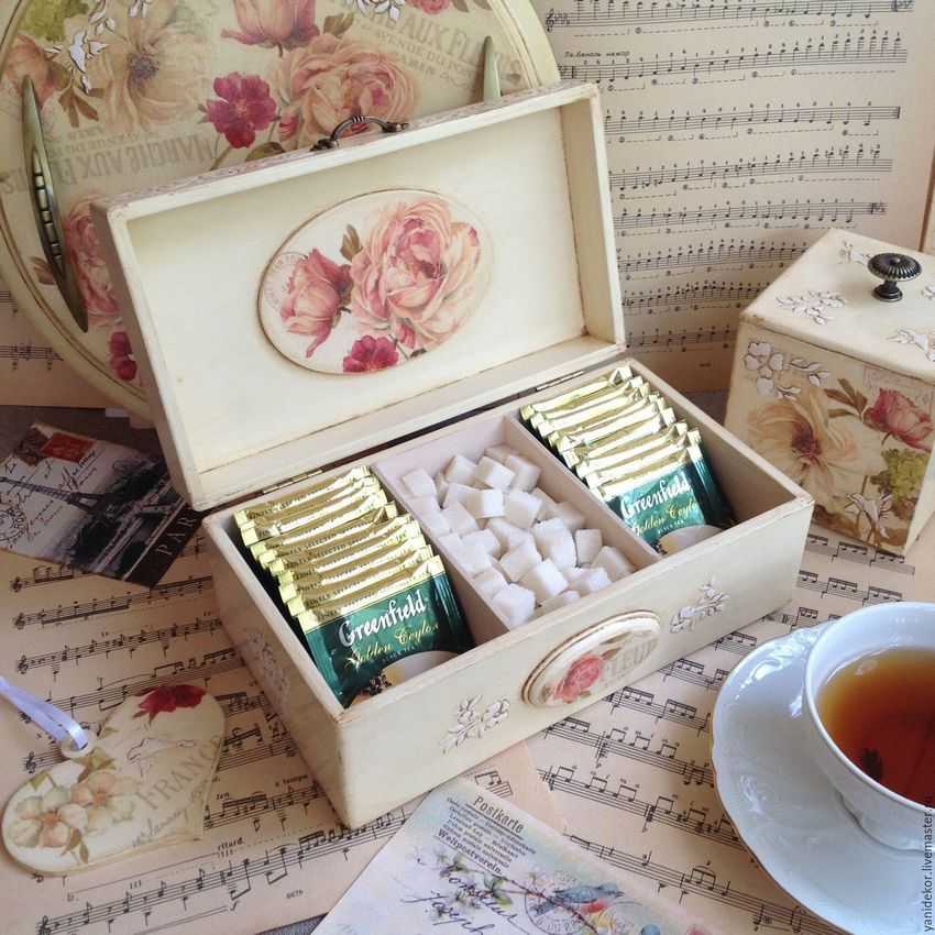 Простая чайная церемония требует не только непременной сахарницы, фарфоровых чашек и вазы с печеньем. Вам нужна коробочка! Она здорово украсит интерьер кухни, поверьте.