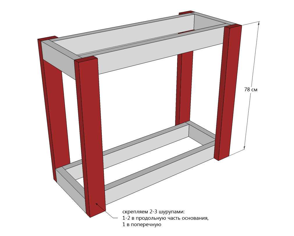 Теперь, когда основания будущих столешниц готовы, сцепляем их вертикальными стойками, как показано на рисунке ниже. Крепление ножек, высота которых составляет 78 см, производим с внешней стороны подготовленных оснований.