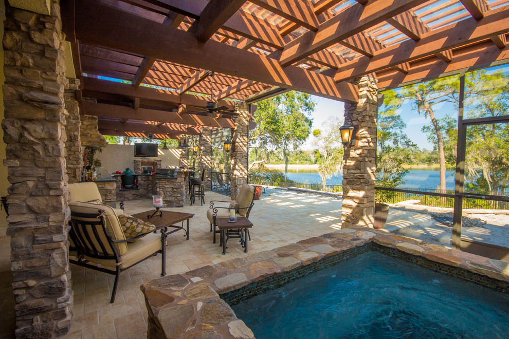Часть площади стоит закрыть навесом, что сделает удобным проведение вечеринок даже в непогоду. Рядом с барбекю можно организовать обеденную зону с летней мебелью, небольшой бассейн или место для активных игр.