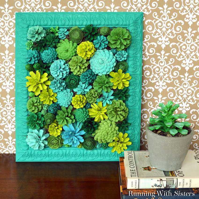Здесь показано, как сделать панно из шишек в виде цветов в красивой рамке. Цветы по своей структуре итак напоминают шишки, а если их еще раскрасить соответствующим образом, то сходство поразительное. Подготовленные и покрашенные сосновые шишки можно использовать по-разному. Один из вариантов – превратить в вертикальный сад. Кроме шишек, понадобится рамка . Также приготовьте горячий клей, зелёную краску различных оттенков, ножовку для обрезания шишек. Дальше, пожалуй, все понятно, просто посмотрите пошаговые фото . Наклеивайте шишки, как вам нравится, пусть они немного выступают за раму. Между шишками можно добавить немного сухого мха .