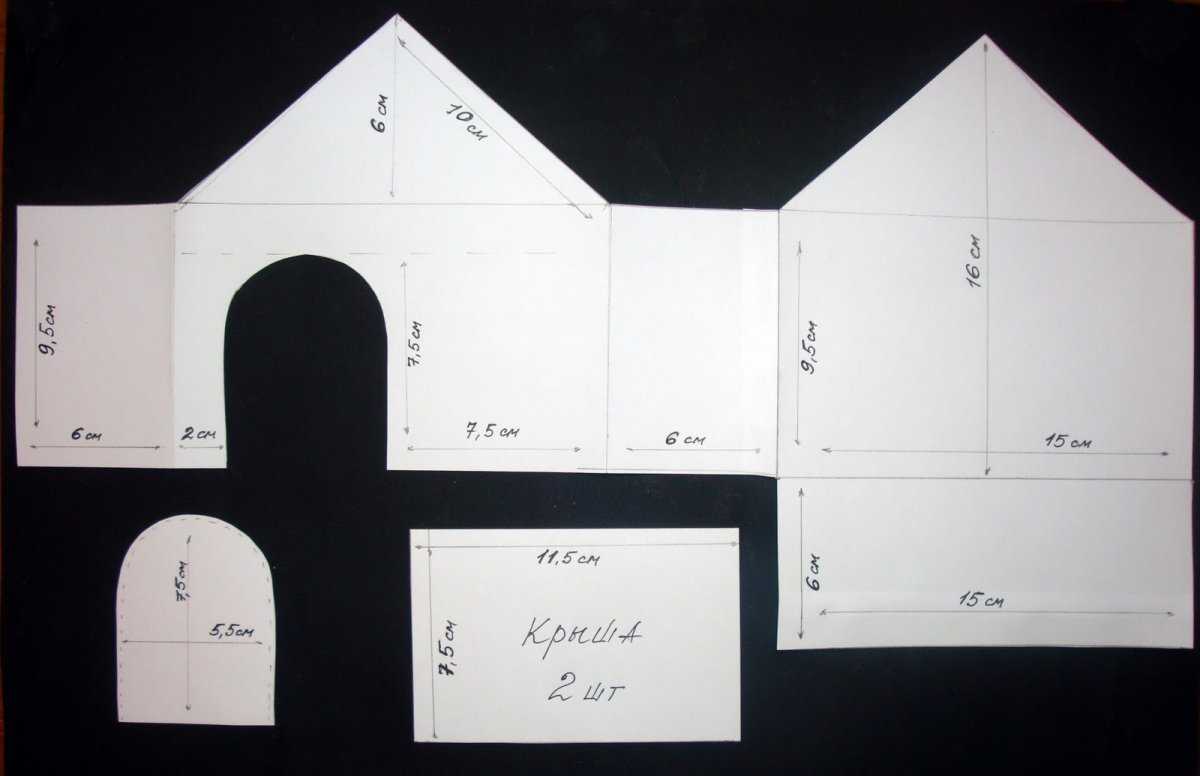 Для начала следует сделать заготовки стен, крыши и основания домика. Для крыши потребуется две детали размерами 7*12 см.