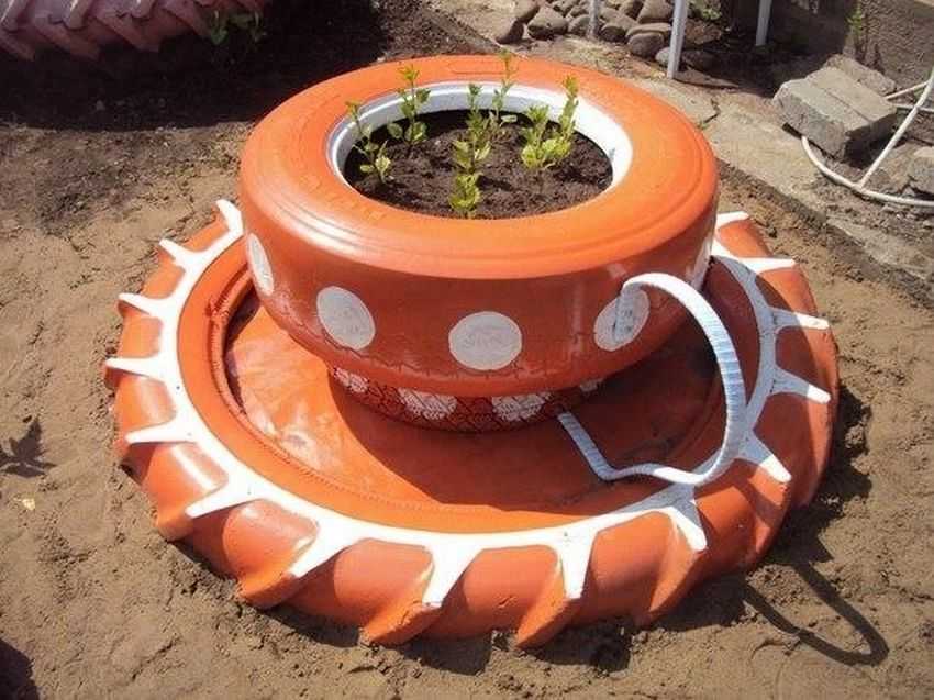 Наиболее легкая схема – берем ненужную шину, засыпаем в нее грунт и сажаем растения. Конечно, это не будет уникальным декоративным элементом садового дизайна.