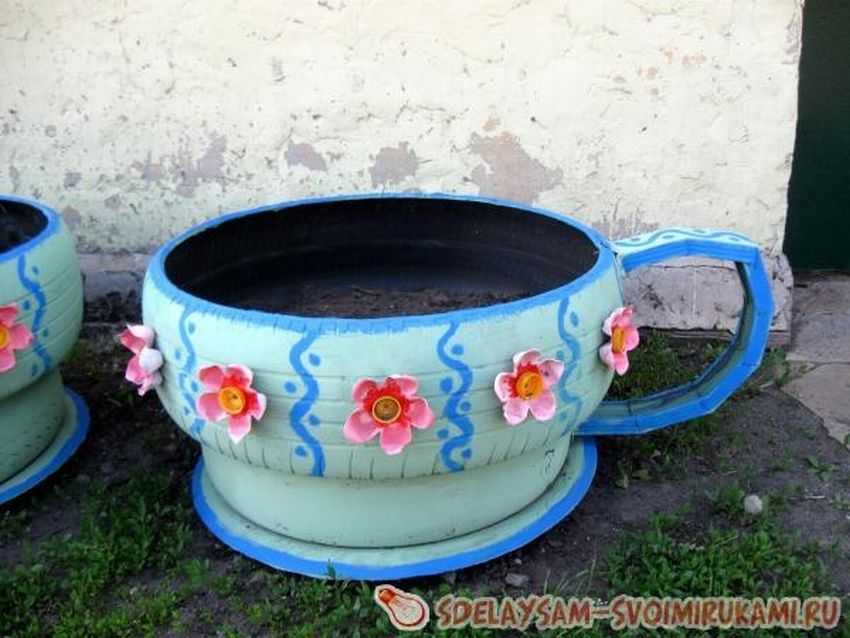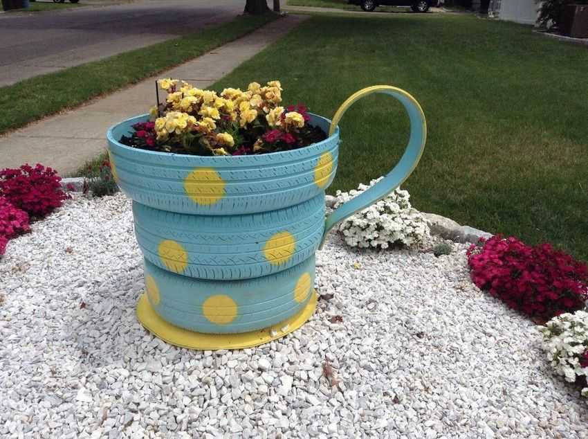Чашка- клумба из покрышек смотрится ярко и стильно