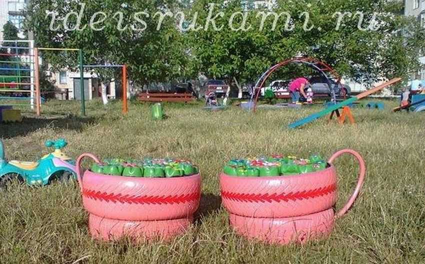 Вариант украшение участка старыми покрышками уже давно набрал обороты. Таким способом декорирования воспользовались уже многие дачи. У кого на что хватает фантазии: от просто покрашенной клубы до целого произведения искусства. Один из вариантов поделок из покрышек –конструирование чашки. Чашки бывают абсолютно разных форм и цветов.