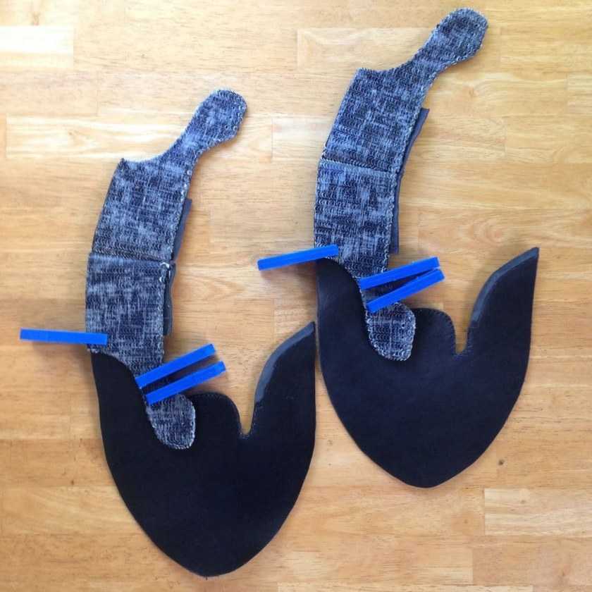 Сделаем сапожок со швом сзади, для этого уложить верхнюю деталь складывая вместе ранее разрезанные с внутренней стороны, обвести. Я для точности сложила вдоль по середине и выровняла длинны вогнутых частей между собой и укоротила голенище на нужную высоту. Также поступить с пяточной частью, здесь небольшой разрез 1.5-2 см сделать от низа по середине пятки (фото отсутствует). Деталь подошвы выровнять что бы было приятно посмотреть, наметить точки соединения (рекомендую сделать это для всех деталей сапожек) и вырезать. На всех этапах сравнивайте срезы выкройки, что бы даль пятки точно вписалась по длине в дугу задней детали голенища, а так же носок четко совпадал с линией дугой голенища и пятки.