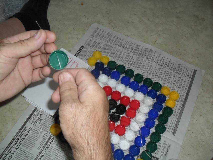 Пластиковые крышки при составлении панно позволяют играть не только с их цветом, но и с размерами, а также комбинациями уложенных друг на друга крышек (см. фото).
