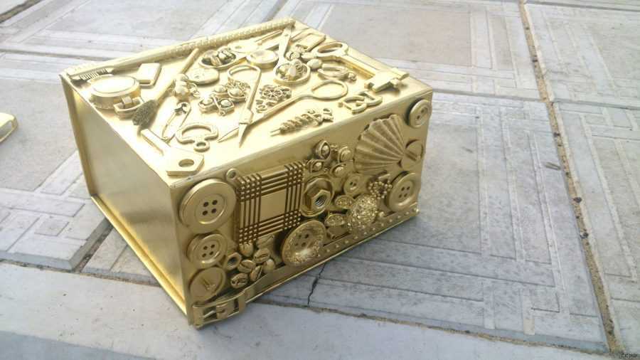 - Коробку покрывают черной акриловой, а затем золотистой краской.