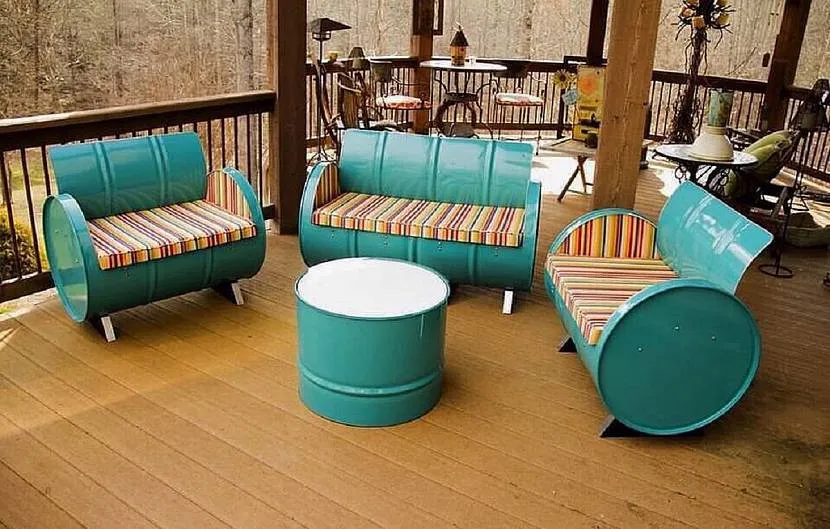 Диваны, стулья и скамейки — нестандартное применение бочек, но и тут открываются широкие перспективы. Декор железных бочек выбирается в зависимости от окружающей обстановки.