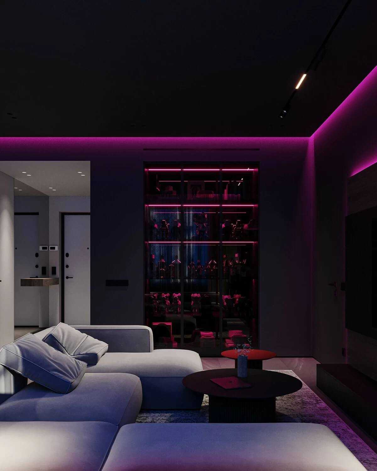 В тёмное время суток оригинальная подсветка может служить ночником. Проект квартиры в ЖК “Royal Park”, дизайнер Артём Алексеев