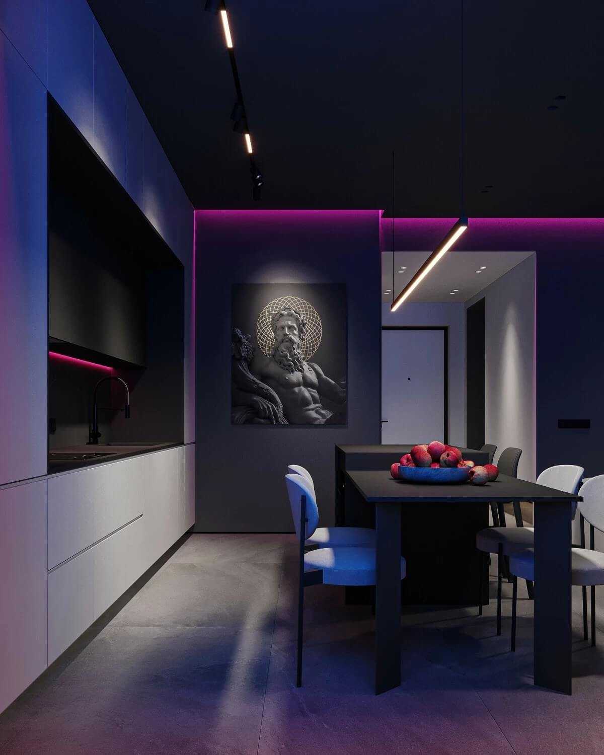 Подсветка стеновой панели в зоне столовой. Проект трёхкомнатной квартиры в минимализме (Волгодонск), дизайнер Артём Алексеев
