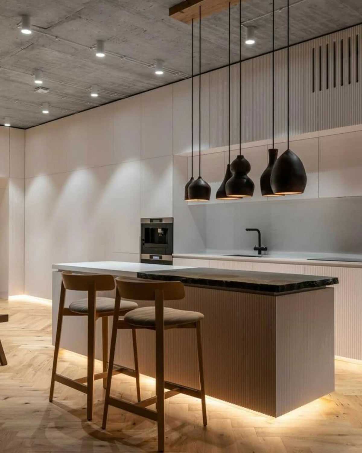 Подсветка нижних секций кухни, острова и плинтусов. Проект квартиры “Mazanka Apartment”, дизайнер Сергей Махно