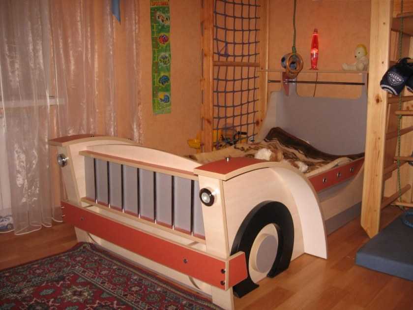 Если у вас несколько детей, то, возможно, в комнате придётся поместить двухъярусный автобус или даже локомотив. Такие детские кровати в виде машины позволяют рационально использовать всё пространство комнаты. Также можно создать кровать «чердак»: изготовленная в виде фургона, она позволяет использовать нижний ярус для сна, а верхний — для развлечений. Или же наоборот: спальное место оборудуется вверху, а снизу размещается игровая зона.