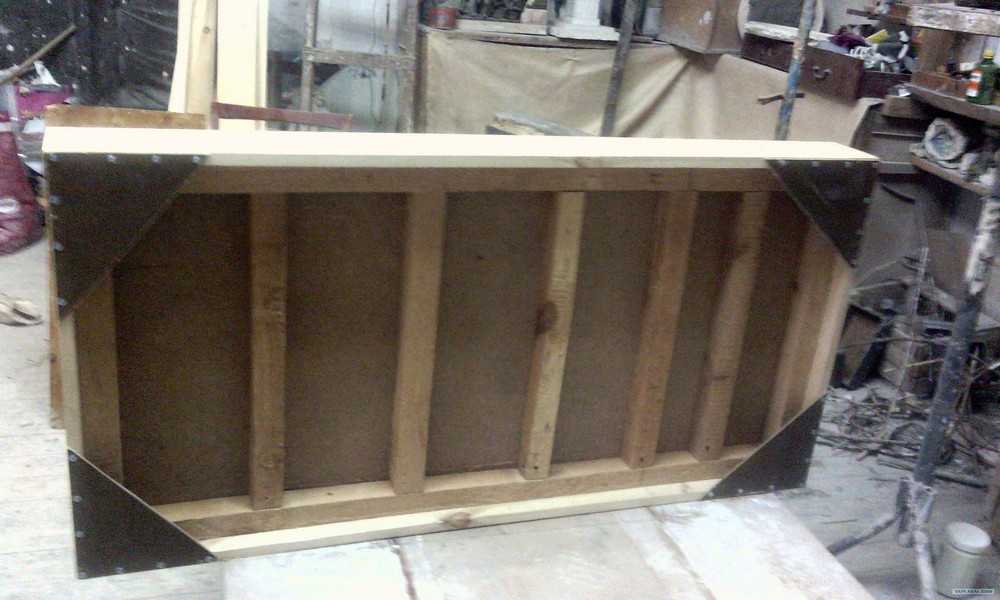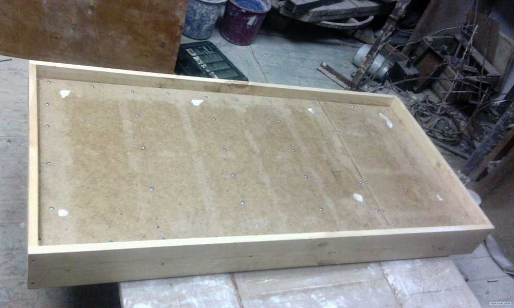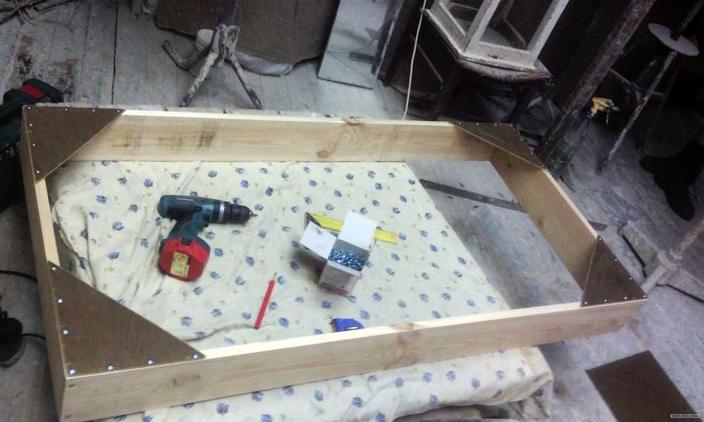 2. Начинать работу нужно с основы. Для низа кровати берется фанера, к которой прикрепляются планки и металлические уголки.