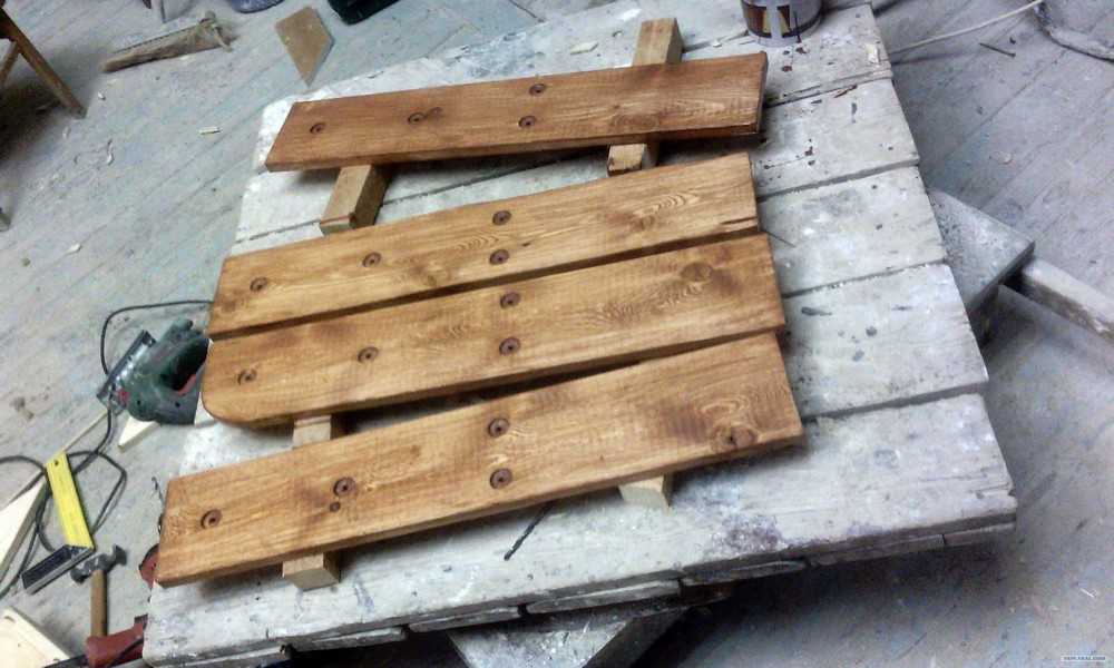 Для работы необходимы поддоны и крепежные средства (подойдет саморезы), а также обычный набор столяра (пила, дрель, шуруповерт, лобзик, наждачная бумага) и отделочные средства (краска, морилка, лак).