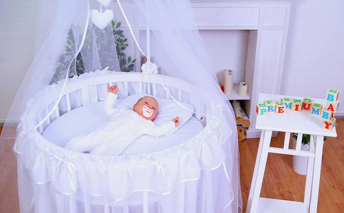 Стандартные размеры кроваток составляют около 90 см в диаметре для круглой колыбели и 125х75 см для овальной кровати. Некоторые модели предполагают возможность расширения спального места до 160х90 см. Высота бортиков регулируется родителями.