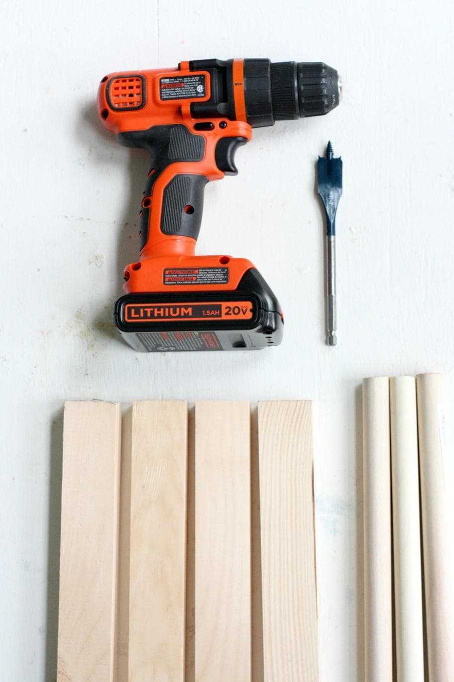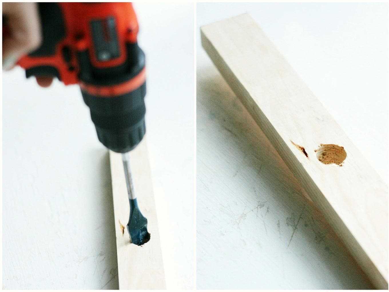 2. На каждой доске просверлите по 2 отверстия диаметром равным диаметру круглых реек — одно сверху, другое снизу.