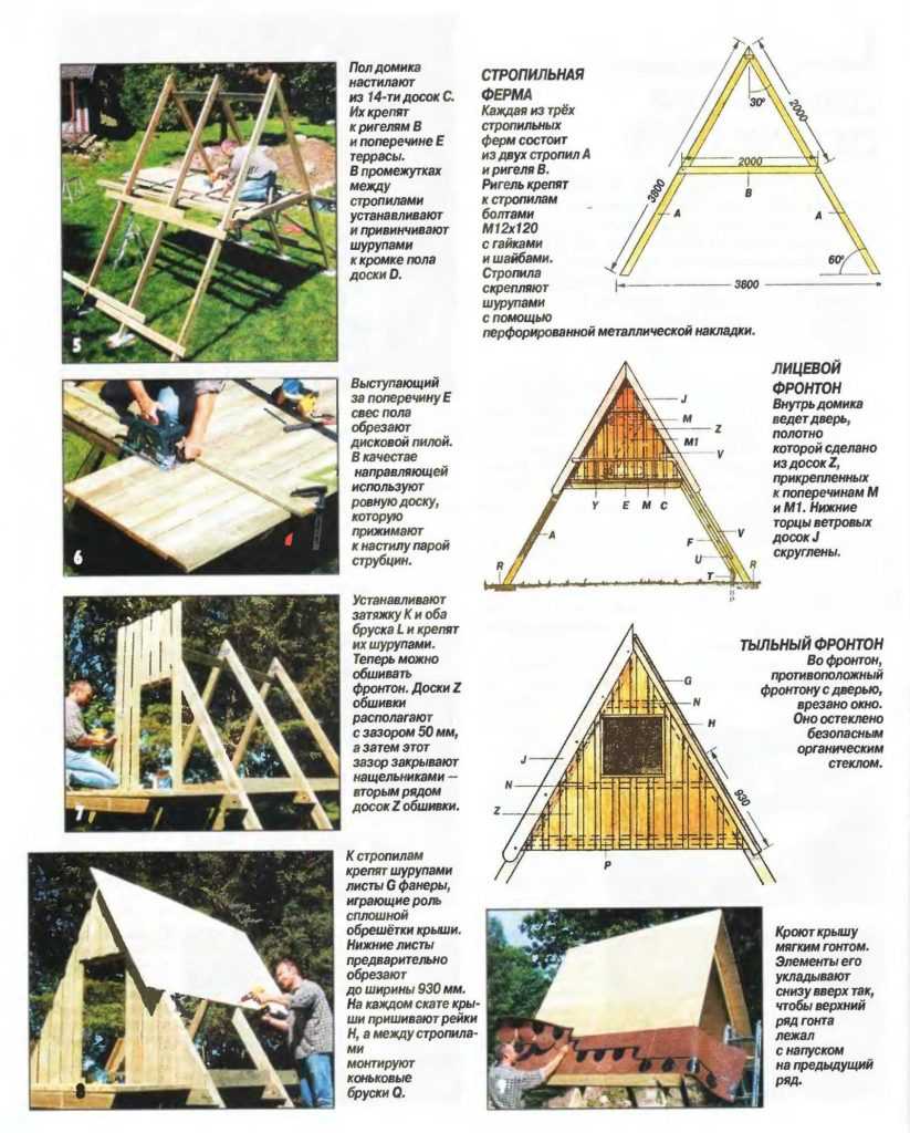 Конструкция палатки-домика чрезвычайно проста. Она представляет собой А-образную раму, сделанную из нескольких деревянных досок и дюбелей.