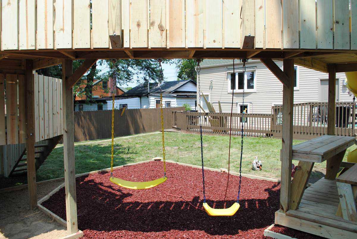 Место для площадки, где будет установлена поделка, лучше выбрать освещенное, просторное, находящееся поблизости от дома. Лучшим покрытием будет засыпка из песка или газон, который придется очистить от камней и стекол, чтобы обезопасить малышей от травмирования.