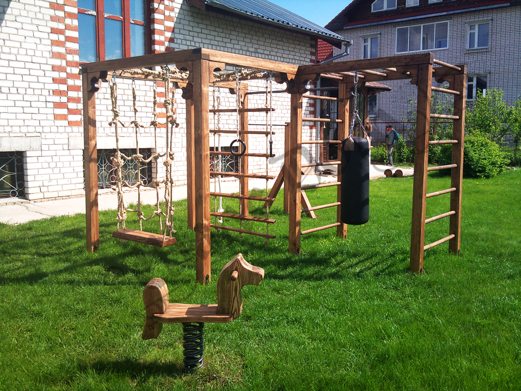 Площадки, в устройство которых входят лестницы, альпинистские сетки, всевозможные снаряды, развивающие ловкость, выглядят интересно — и обязательно понравятся активным детишкам. Будьте уверены, этот комплекс надолго займет ваше непоседливое чадо. Однако соорудить самостоятельно нечто подобное будет проблематично и весьма затратно.