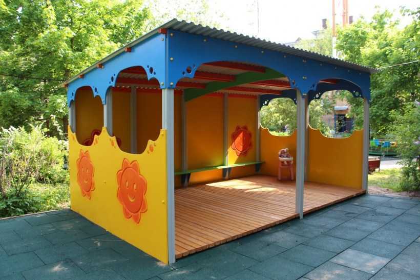 Миниатюрная беседка – паровозик, машинка, замок, гриб. Высота конструкции соответствует росту ребенка (не более 0,8 м). Внутри мини-беседки обычно находятся одно или два сидения.
