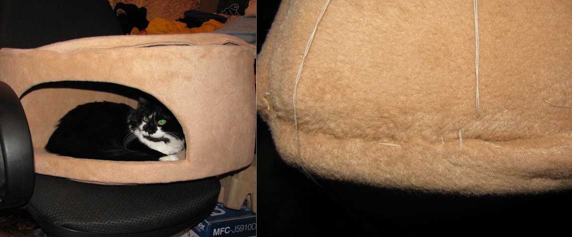 Обшиваем детали флисом ручными большими стежками. В деталь днища дополнительно закладываем синтепон – так хозяину домика будет мягче спать.