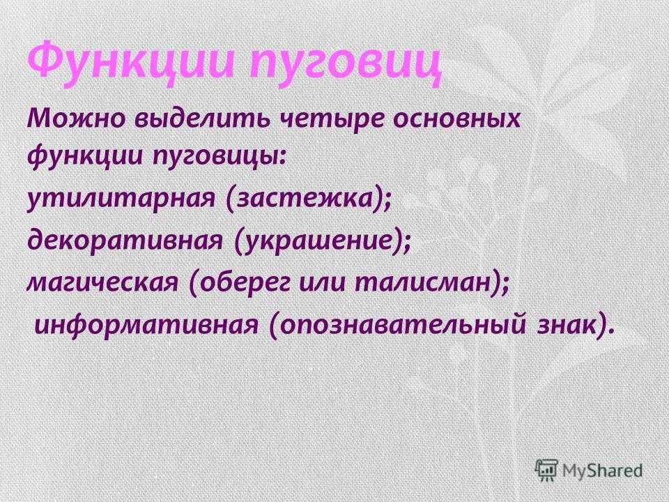 Функции пуговиц Можно выделить четыре основных функции пуговицы: утилитарная (застежка); декоративная (украшение); магическая (оберег или талисман); информативная (опознавательный знак).