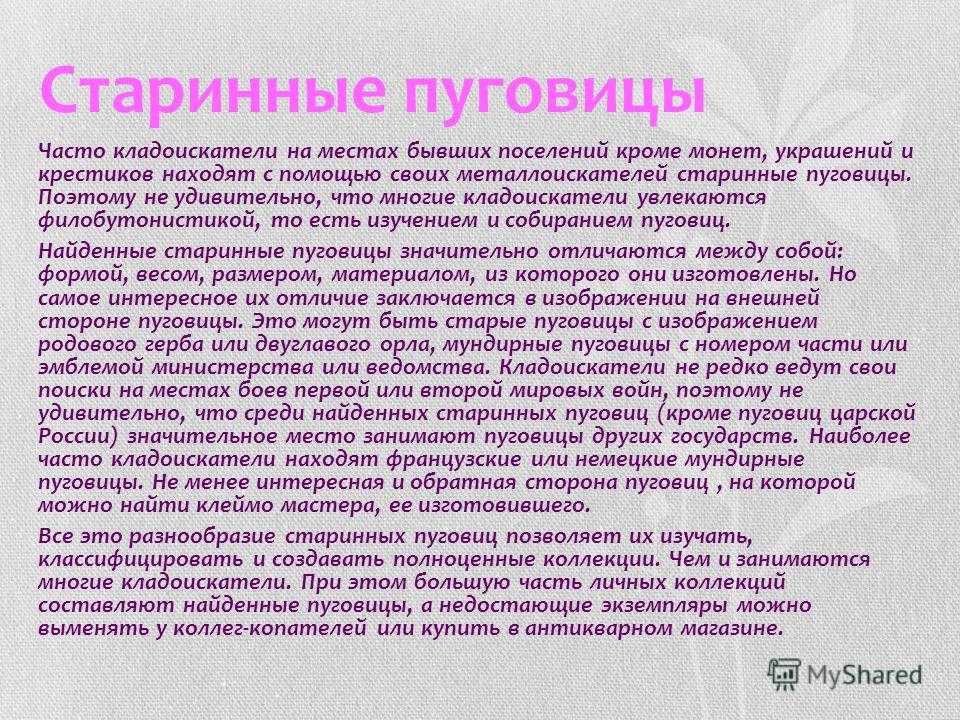 Старинные пуговицы Часто кладоискатели на местах бывших поселений кроме монет, украшений и крестиков находят с помощью своих металлоискателей старинные пуговицы. Поэтому не удивительно, что многие кладоискатели увлекаются филобутонистикой, то есть изучением и собиранием пуговиц. Найденные старинные пуговицы значительно отличаются между собой: формой, весом, размером, материалом, из которого они изготовлены. Но самое интересное их отличие заключается в изображении на внешней стороне пуговицы. Это могут быть старые пуговицы с изображением родового герба или двуглавого орла, мундирные пуговицы с номером части или эмблемой министерства или ведомства. Кладоискатели не редко ведут свои поиски на местах боев первой или второй мировых войн, поэтому не удивительно, что среди найденных старинных пуговиц (кроме пуговиц царской России) значительное место занимают пуговицы других государств. Наиболее часто кладоискатели находят французские или немецкие мундирные пуговицы. Не менее интересная и обратная сторона пуговиц, на которой можно найти клеймо мастера, ее изготовившего. Все это разнообразие старинных пуговиц позволяет их изучать, классифицировать и создавать полноценные коллекции. Чем и занимаются многие кладоискатели. При этом большую часть личных коллекций составляют найденные пуговицы, а недостающие экземпляры можно выменять у коллег-копателей или купить в антикварном магазине.