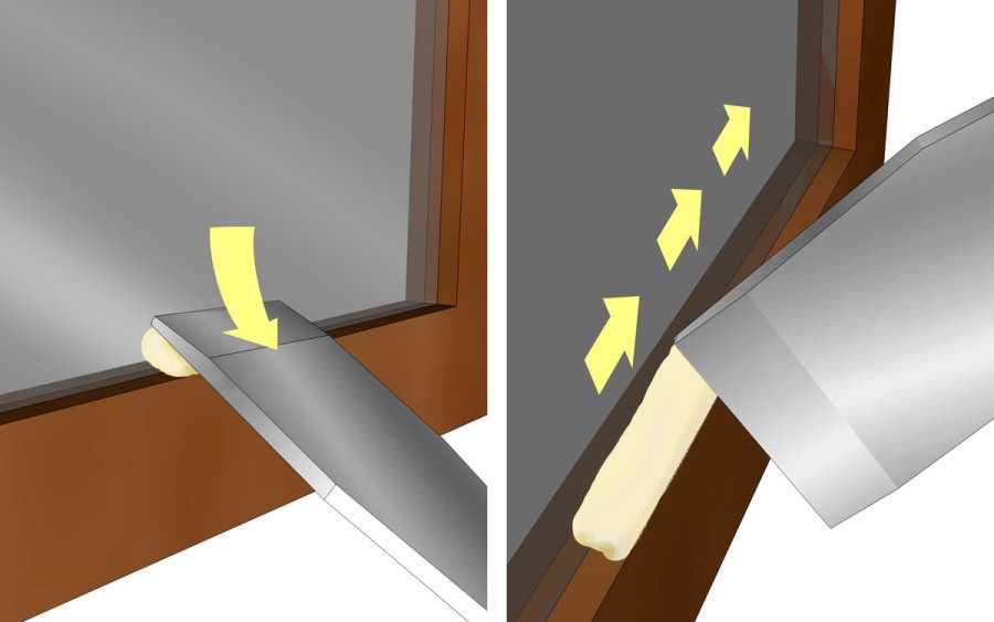 Остекление деревянного окна происходит в обратном порядке. По периметру стекла нанесите силиконовый герметик. Вставьте его посередине проема. На нижний край рамы положите спички для создания зазора. Нанесите герметик и на другую сторону стекла под штапик.