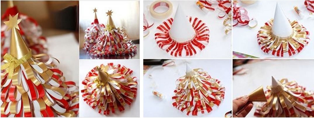 - Теперь при помощи скотча приклеивайте самую длинную бахрому. Чуть выше покороче и так до тех пор, пока весь конус не будет обклеен бахромой из пластика. Верхушку украсьте звездочкой или шишкой