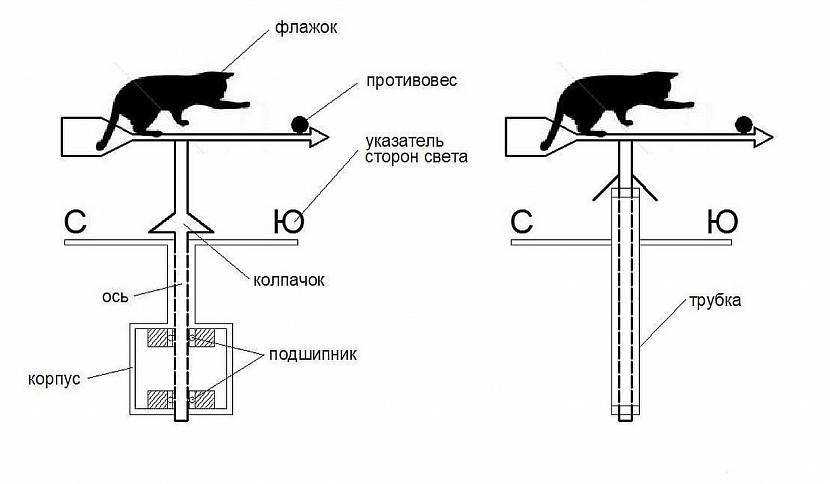 Большинство конструкций флюгеров для крыши изготавливаются по аналогичной схеме, основные отличия могут касаться оформления узла вращения. Для габаритных и тяжелых флюгеров применяется подшипник скольжения, проще говоря, закаленная стальная ось, вставленная в металлическую трубу. Силуэты с небольшой парусностью обязательно устанавливают либо на закаленный стальной шарик, либо на пару подшипников качения.