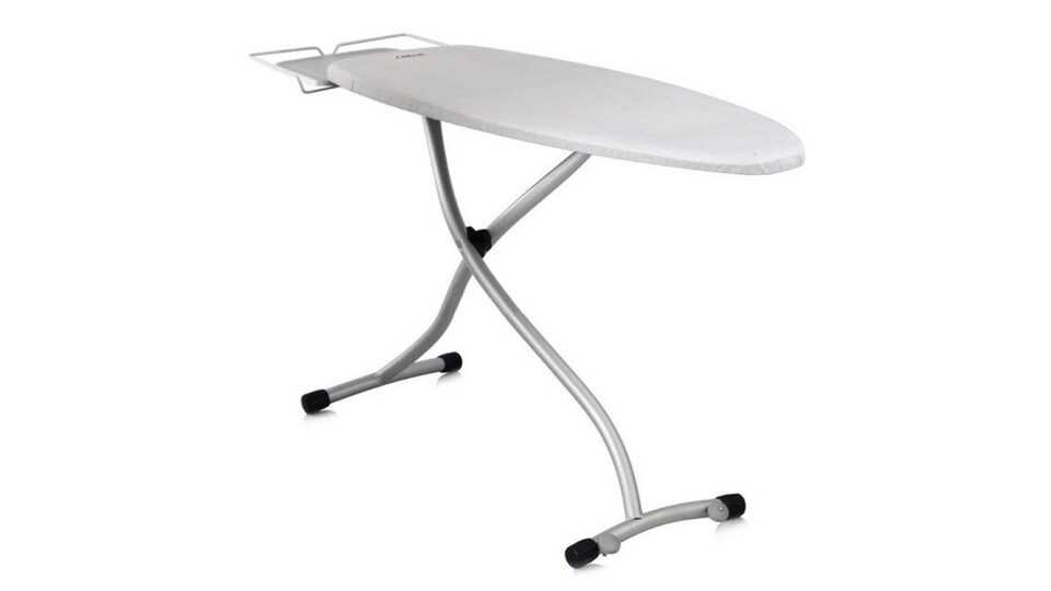 Модель с изогнутыми металлическими ножками. Но это не ошибка тех, кто ее делал, а наоборот — находка. Так она должна быть более устойчивой. Также серебристая доска дополнена однотонной рабочей поверхностью. Столешница здесь из доски-сетки, пропускающей пар. Модель получила подставку для утюга. Как говорят продавцы, эта доска легко складывается, что позволяет ее хранить практически в любом месте.