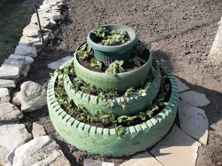Возводят грядки для саженцев клубники из автомобильных покрышек. Сложным является поиск шин разного диаметра. Именно с разными покрышками получится пирамидка с плавным переходом ярусов.